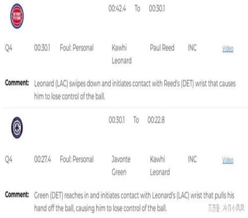 比赛还剩下30秒时,裁判报告指出,伦纳德在抢断时打到了保罗里德的手腕,应该吹罚伦纳德犯规。比赛还剩下27秒时,贾文特格林在防守时打到了伦纳德手腕,导致后者失去对球权的控制,应该吹罚格林犯规。